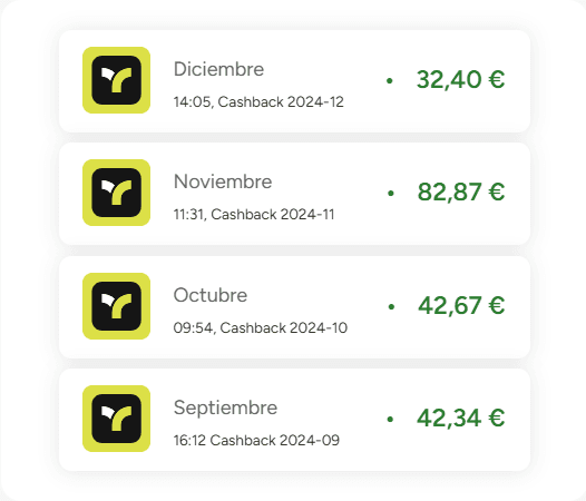 Convierte cada euro que gastes con tus tarjetas de Teya en una recompensa real. Por cada compra, obtienes un 0,5 % de cashback en efectivo, que se abona mensualmente en tu cuenta. Además, se acumula en todas tus compras, sin límite máximo.