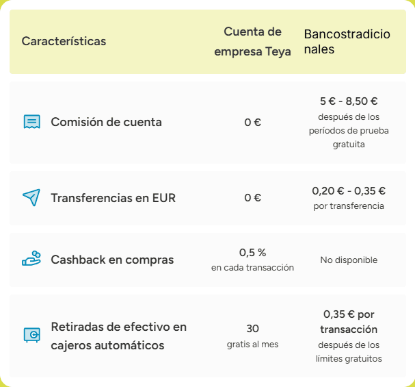En muchos bancos tradicionales, las comisiones pueden pasar desapercibidas y acumularse con el tiempo. La Cuenta de Empresa de Teya apuesta por tarifas claras, bajas o inexistentes, y una transparencia total para que puedas gestionar las finanzas de tu negocio sin sorpresas.