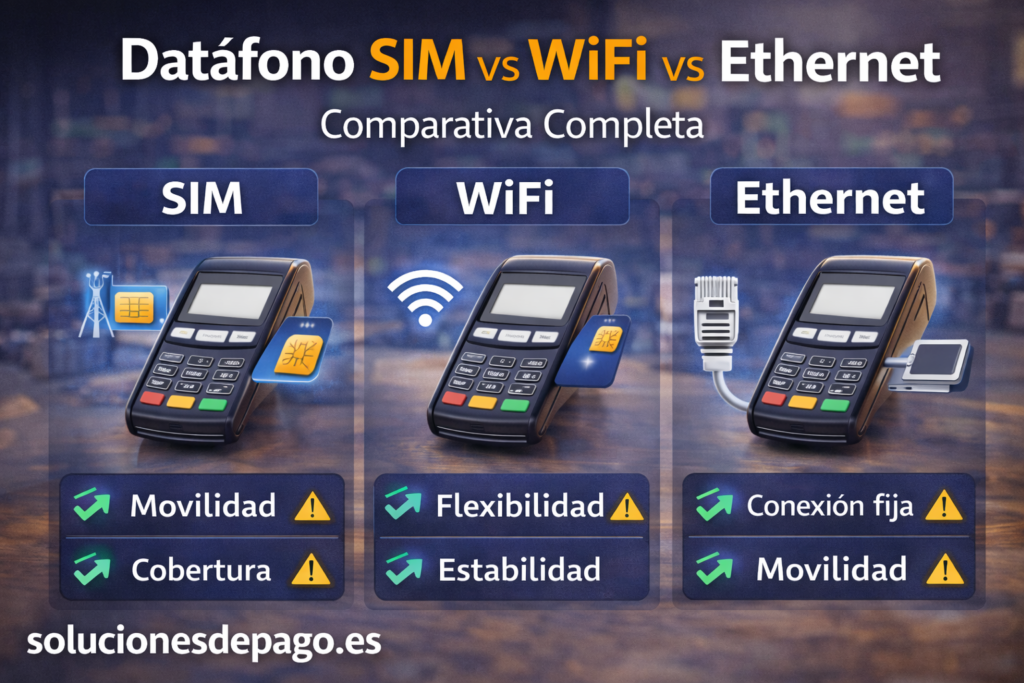 Cuando una empresa decide implantar o renovar su sistema de cobro, suele fijarse primero en el precio del terminal, en las comisiones o en la marca del proveedor. Sin embargo, hay una decisión técnica que afecta de forma directa a la operativa diaria y que muchas veces se subestima: la conectividad del dispositivo. Entender bien la diferencia entre un datáfono con SIM, uno conectado por WiFi y otro con Ethernet es fundamental para evitar errores que luego se traducen en pagos lentos, incidencias en hora punta o una mala experiencia para el cliente. Un terminal de pago necesita una conexión estable para enviar la información de la transacción, autorizar el cobro y confirmar el resultado en pocos segundos. Si esa conexión falla o no está adaptada al entorno del negocio, el problema no se queda en lo técnico. Se convierte en una cola en caja, en una mesa esperando la cuenta, en una venta que tarda demasiado en cerrarse o en un cliente que pierde confianza. Por eso, igual que conviene estudiar cómo elegir un datáfono para tu empresa antes de contratarlo, también merece la pena analizar qué tipo de conexión encaja mejor con la forma real en que se cobra cada día. En el mercado actual, las tres opciones más habituales son la conexión por tarjeta SIM, la conexión WiFi y la conexión Ethernet por cable. Las tres permiten aceptar pagos con tarjeta, pero no se comportan igual. La SIM aporta independencia y movilidad, el WiFi ofrece flexibilidad dentro del local y Ethernet destaca por estabilidad en puntos fijos. Lo importante es entender que no existe una respuesta universal. Un restaurante con terraza, una tienda de ropa, una clínica, una panadería o un negocio de reparto no comparten exactamente las mismas necesidades. Además, la conectividad ya no debe analizarse como una decisión aislada. Muchas empresas combinan cobros presenciales con reservas, pagos remotos o ventas digitales. En ese contexto, el terminal forma parte de un sistema más amplio de plataformas de pago en España, donde cada canal debe cumplir una función clara dentro de la experiencia del cliente y de la operativa del negocio. Por eso, elegir bien la conexión del datáfono no es un detalle menor. Es una decisión que influye en la velocidad del cobro, en la fiabilidad del servicio, en la movilidad del personal y en la capacidad de la empresa para trabajar con menos fricción. Cuanto mejor se adapte el terminal a la realidad del negocio, más natural será el momento del pago y menos problemas aparecerán en el día a día.Por qué la conexión del datáfono influye más de lo que parece en el día a día